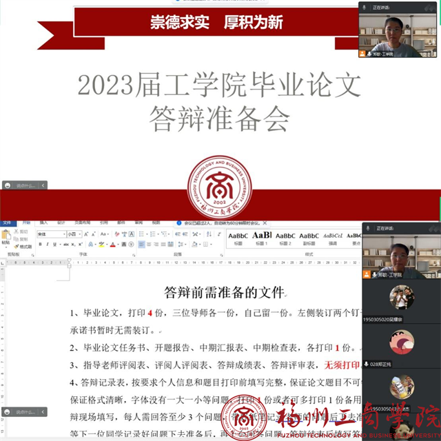 在答辩准备会上,指导教师耐心地讲解答辩前需准备的各类材料,重点强调答辩环节中的答辩要求与注意事项,针对学生的问题进行一一解答。