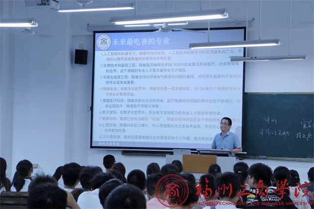 会上郭躬德院长首先从专业认知上,介绍计算机科学与技术专业的设置背景、就业前景和就业方向,帮助新生了解并认同所学专业;其次从学业规划上,在培养目标定位、核心领域知识、实践教学、学制学位、职业认证等方面,告诉学生在大学期间应该学习什么,以及学校可以提供的教学资源和条件;接着从学业管理上,强调学校的教学团队、实践基地、图书资料等方面的优势,同时提醒学生注意学籍管理、学生考勤、奖学金评定等方面的要求,旨在帮助新生更好地适应大学的学习生活;最后对全体新生提出了殷切期望和学习要求。