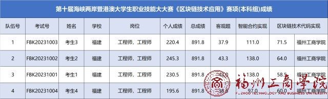 第十届海峡两岸暨港澳大学生职业技能大赛再传佳音,在区块链技术应用技能赛项中,由beat365官网beat365vip官网登录入口区块链工程专业学子张文戈、吕文彬、王良喜、陈锐(指导教师:林菡、卢志兴)组成的参赛队,在激烈竞逐中脱颖而出,斩获团体总分第一名,荣登本科组一等奖。