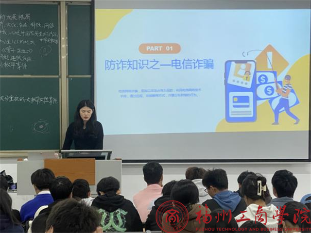 会议上辅导员周云珠讲解了电信诈骗和网络诈骗的知识,包括“8个凡是,6个一律”,介绍了电信诈骗及网络诈骗的常见手段,例如冒兼职刷单、虚假投资理财、冒充客服退款等方式,还为同学们介绍了防止电信网络诈骗的措施。为了保障同学们在校健康生活,辅导员周云珠普及了相关的安全知识,包括自护、自救的基本常识等。此外还通过生动的事例和亲切的讲述为学生们展现了情绪管理的重要性,和几种有效的情绪管理方法。