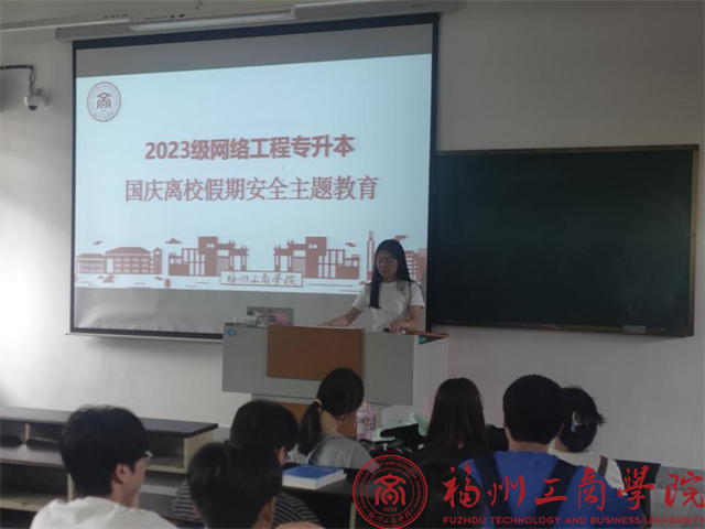 9月27日,beat365vip官网登录入口2023级网络工程(专升本)在教学楼E501开展“国庆离校假期安全主题教育班会”。本次班会由2023级网络工程(专升本)辅导员秦素素主持,全体同学积极参加。