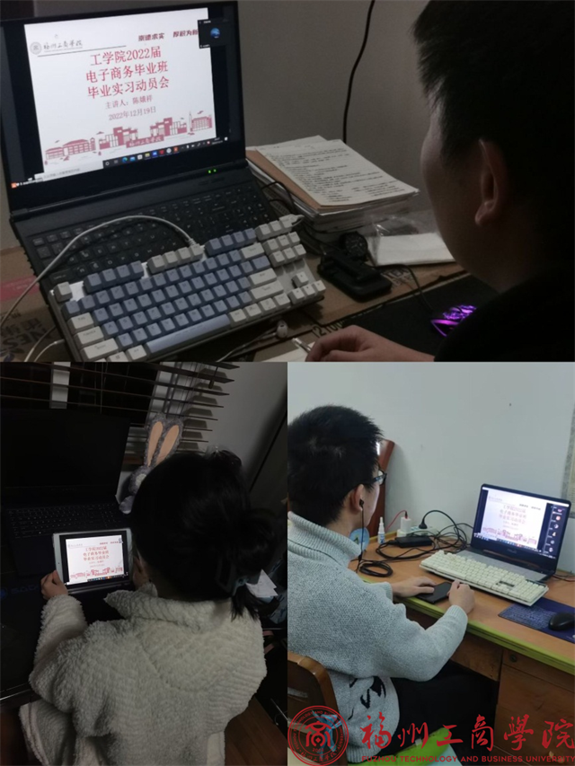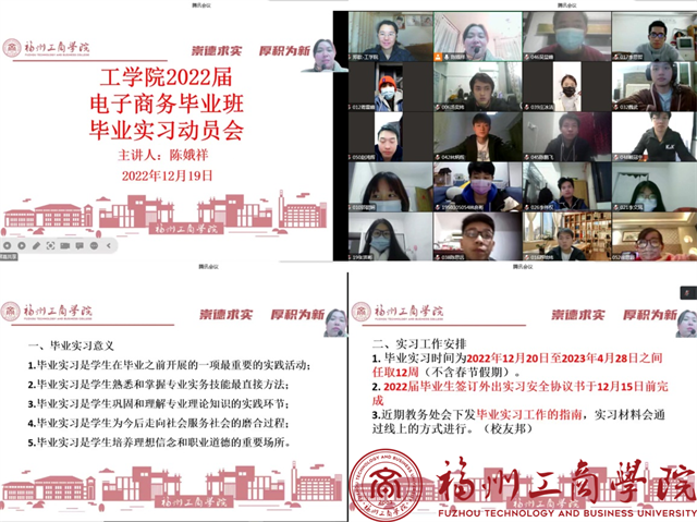 为推进毕业实习工作顺利开展,引导学生做好实习前的各项准备,12月19日,我院电子商务专业在线上召开了2023届毕业实习动员大会。本次大会由电子商务专业负责人陈娥祥老师主持,班主任郑歆老师以及2019级电子商务专业全体同学参加了本次大会。