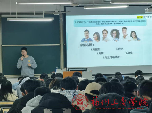 为引导同学们树立正确的就业观、成才观,科学规划大学生涯和未来职业生涯,帮助同学们提前了解就业形势,2021年12月2日下午,校企合作单位福建东方锐智信息科技集团莅临我院开展“大学生学业规划与就业指导”讲座,洪圣老师主讲,2019级全体同学参与。