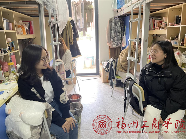 从走访宿舍了解到学生的住宿环境、卫生和宿舍安全设施,学生之间的相处情况,学生期末复习的情况和考试状态,通过交谈,了解学生在面对学习压力时的困惑,也给了学生期末复习课程的一些建议,需要合理安排时间,期末考试一定不能作弊,另外也询问了学生的寒假打算,同时也指导学生要把经历当作财富,从小事做起,踏实进取,从专业能力、时间规划和人际交往等各方面锻炼自己。
