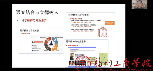 戴开宇副教授首先介绍混合式教学理念的概念及优缺点,其次以自身教授的程序设计课程为例,从课程沿革、教学理念和方法、混合性教学设计,融合多元教学法、通专结合与立德树人、课程思政、教学效果等方面进行了在线教学经验分享交流,他重点介绍了混合性教学设计的理念、多元教学法中项目式学习的具体做法,其引导学生自主学习、注重学生的学习感受和学情反馈、鼓励学生演讲分享、实践和作业中联系前沿技术让学生学以致用等理念让我收获很多。