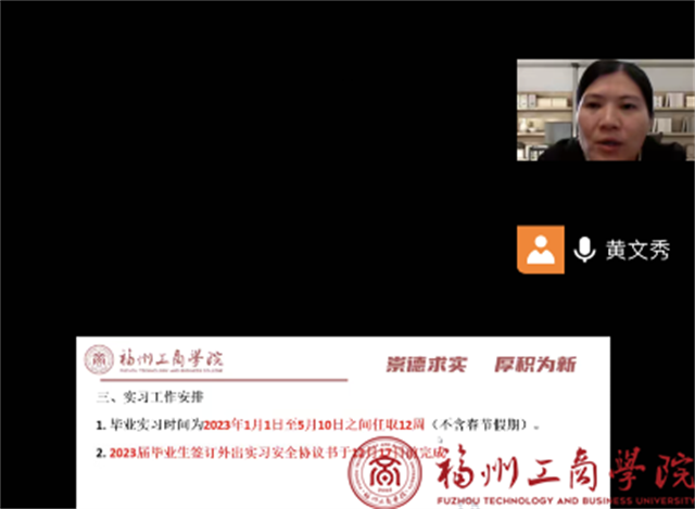 教研室负责人黄文秀老师表示毕业实习是人才培养中非常重要的部分,是毕业生走向社会的关键一步,详细说明了实习的意义、实习的具体要求、实习具体安排及实习中可能存在的问题;黄老师还从人身安全、疫情防控、安全技能、防范电信诈骗等方面进行了安全教育,提醒毕业生在实习过程中要注意安全,以饱满的热情去完成实习,时刻与学校保持联系;最后就实习岗位落实、协议签订和实习考核要求等内容作了说明,并解答了学生对于实习问题上的一些困惑。