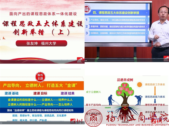 本次研修课程的主题是“面向产出的课程思政体系一体化建设”,主讲人是福州大学的张友坤老师。张老师在课程中强调:在课程教学过程中,我们要围绕“品德修养”建立思政课程与课程思政同向同行课程矩阵,提高学生的思想水平、政治觉悟、道德品质和文化素养,使学生能够明大德、守公德、严私德。