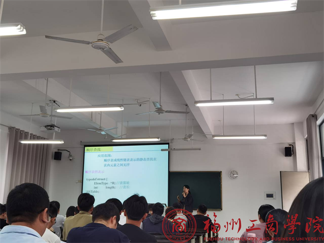 施键兰老师带领同学们一起回顾了前六章的知识框架,接着讲解新的章节第七章,从第一章线性表(顺序存储)数组实现的查找算法导入,接着设置哨兵对算法进行优化。然后进行课堂活动,让学生猜数字,很多学生都参与到了其中,从而引入了折半查找的思想,最后再详细地介绍该算法。此外还介绍了(索引,目录)类似与查找字典,分块查找的思想。