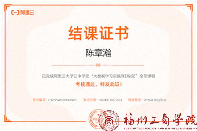 10月18日至10月22日,beat365vip官网登录入口教师陈章瀚参加了阿里云大学云中学堂举办的“大数据学习实践课(高级)”课程,并凭借出色的表现,顺利通过了全部课程的考核。此次学习经历不仅显著提升了陈老师及其团队在大数据处理和分析方面的能力,也为他们未来的学术研究和实际工作奠定了坚实的基础。